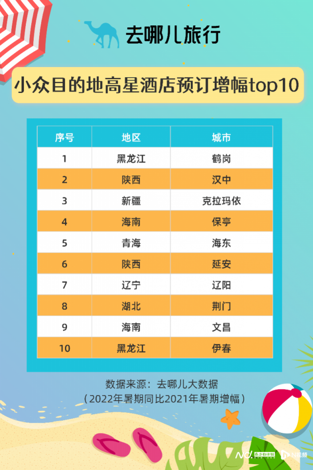 截至9月22日,据去哪儿平台显示,黑龙江鹤岗、陕西汉中、新疆克拉玛依、海南保亭、青海海东、陕西延安、辽宁辽阳、湖北荆门、海南文昌、黑龙江伊春等非传统典型的旅游城市四星、五星酒店暑期预订量同比2021年增长均超3倍,其中黑龙江鹤岗最为夸张,增幅最高达7倍。