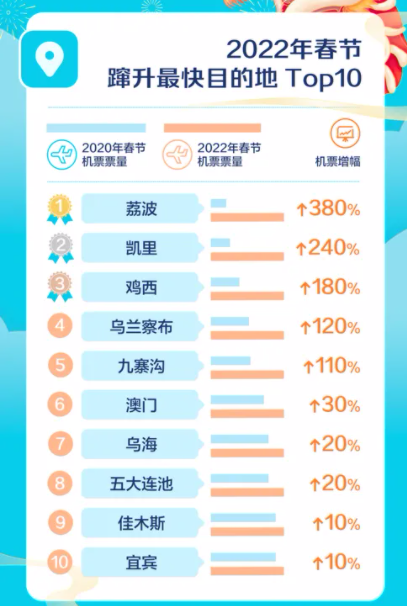 早在2022年春节,蹿升最快的10个目的地中除了澳门之外,其余9个都是冷门的小众城市。