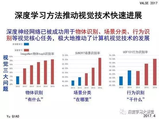 在过去的五年时间中,深度学习方法极大地推动了计算机视觉技术的发展。在这里我列出了物体识别、场景分类和行为识别领域三个广泛使用数据集的效果,其中蓝色的柱状图表示非深度学习方法的结果,红色的柱状图表示深度学习方法的结果,可以看到在这三个问题中深度学习方法都取得了比传统方法更好的结果。