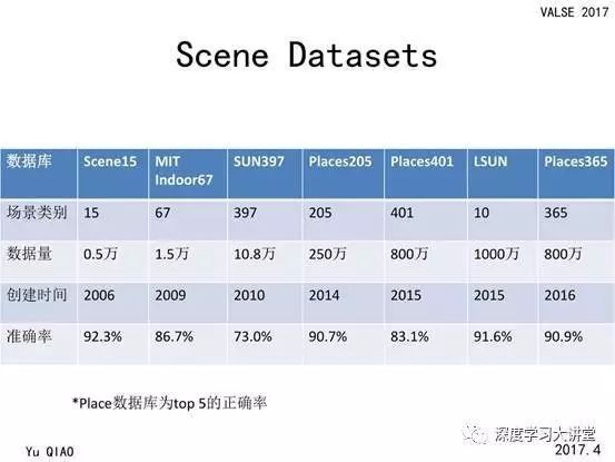 较早的是2006年的 Scene15,只有几千张图片和15个类别,之后其被扩展为 MIT Indoor 和 MIT Outdoor 这两个数据集。随着时间的发展,新的数据集也变得越来越完善,数据量可以达到千万的级别。可以看到各个大数据集的识别率还不是很高,与物体识别如ImageNet的识别率相比还存在着比较大的差距。从这个意义上讲,场景识别要比物体识别更难,其识别率还有很大的提升空间。