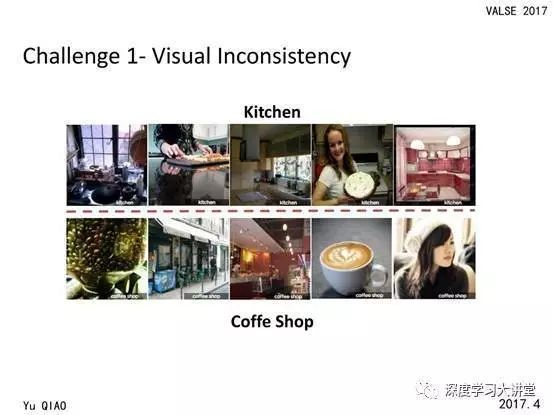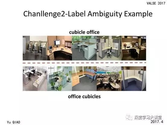 场景识别的难点在于类内的差异性和类间的相似性。比如图中的“厨房”这个场景就具有很多不同的表现形式,同一个场景中出现的物体会非常多样,这就是类内的差异性。还有一些非常相似的来自不同类别的场景,比如图中的“cubicle office”和”office cubicles“却几乎无法分辨,这就是类间的相似性。
