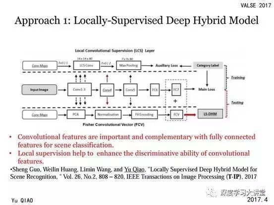 既然卷积层特征很有用,那么我们是否能进一步增强卷积特征呢?在卷积神经网络的训练中,这些特征与监督loss函数比较远,在进行反向传播时需要经过很多层才能将梯度传播到这些卷积层中。这有可能会影响卷积特征的判别能力。为解决这些问题,我们设计了特殊结构使得监督信息能够更为直接作用于卷积层,这样可以进一步提高场景识别的准确率。这是我们在 TIP2017上的一个工作。