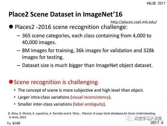 现在用的比较多的场景识别数据集是 Place,由麻省理工学院的研究组创立,并且在2015年和2016年都举行了相应的竞赛,我们团队也参加这些竞赛,并取得了较好的名次。这个数据库含有365个类别,但是每个类别具有的图片数目相差很大,共800多万张训练图片和30多万张测试图片,其数据规模是大于 ImageNet 数据集的。根据对这个数据集训练得到的模型,我们发现其与 ImageNet 数据集具有很大的差异,同时也具有很强的互补性。
