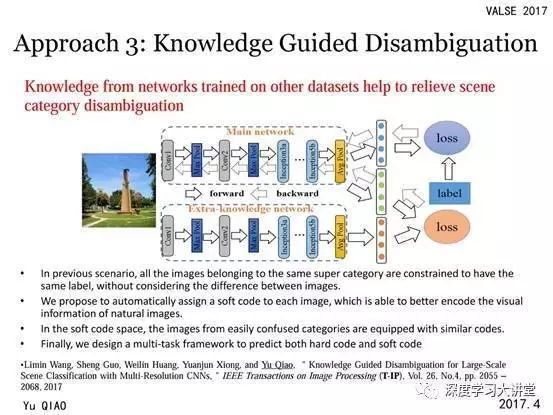 我们的第三个工作是对监督信息进行改进。我们发现相同的场景之间的差别非常大,而不同的场景之间也会具有很大的相似性,这些会对深度网络的监督学习产生干扰。但是对于人来说识别场景非常简单,这是因为人具有很多先验知识,这些知识体现在对物体的识别上。受到这种启发,我们将从其他数据集中学习到的知识迁移到场景识别这个任务中,并且得到了很好的实验结果。我们认为对于知识的使用将会对计算机视觉任务产生很有益的影响。