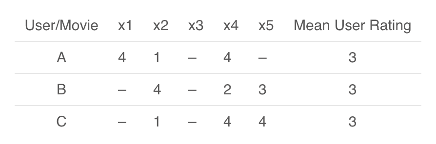 用户 A 和 C 共同评分的电影是 x2 和 x4,B 和 C 共同评分的电影是 x2、x4、x5。