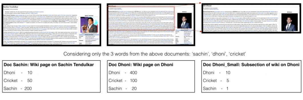 上图统计了 sachin、dhoni、cricket 这三个词在所示的三个文档中的出现次数。