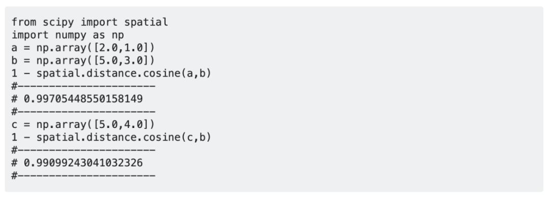在任意类型的算法中,最常见的相似度度量是向量之间夹角的余弦,即余弦相似度。