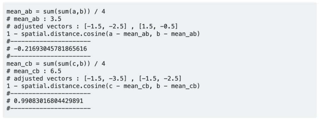 顺便一提,在上一篇有关推荐系统的文章中,我们给出了以下用于计算调整后余弦相似度的函数: