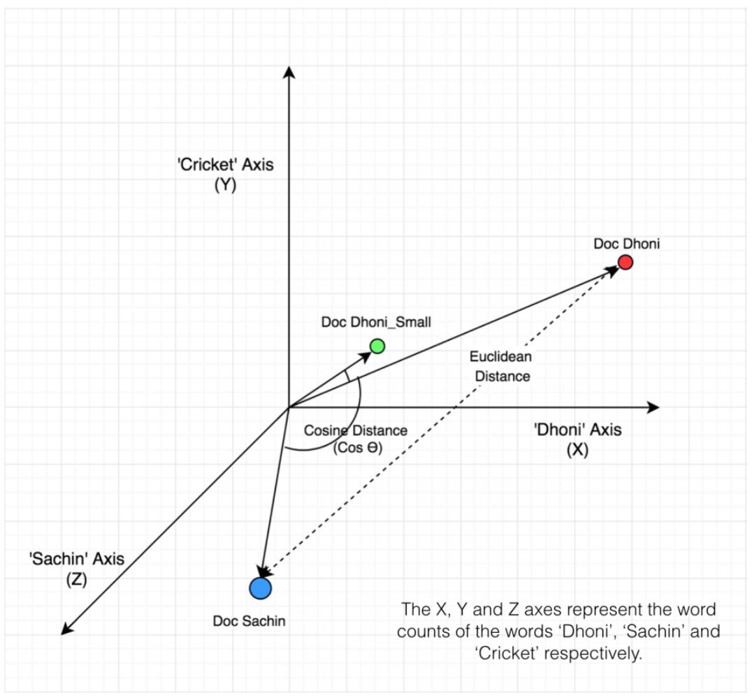 据此,我们可以绘出这三个向量的图,从而轻松地看出衡量这些文档的余弦和欧几里德距离的差异: