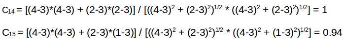为了以更加实用的方式理解这一点,我们先根据上表计算一下用户 (A, C) 和 (B, C) 的相似度。