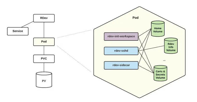 每个 RDev 都由一个 Kubernetes Pod 备份,该 Pod 由三个不可变的容器组成:RDev-init-workspace、RDev-sshd 和 RDev-sidecar。它还有两个主要的卷挂载,Home 和 Rdev Info,以及其他与证书和安全有关的必要卷。