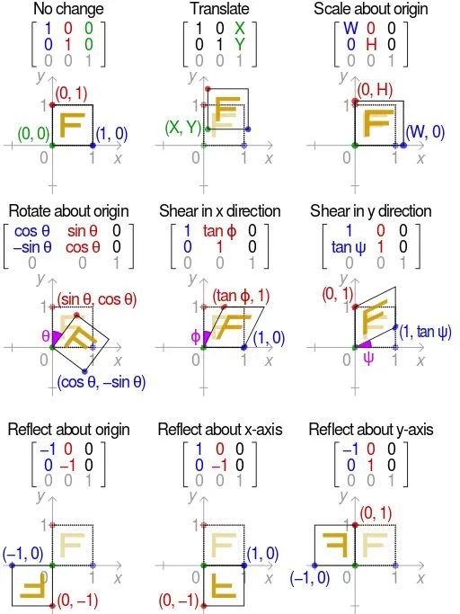 可以看到,相比刚体变换(旋转和平移),仿射变换除了改变目标位置,还改变目标的形状,但是会保持物体的“平直性”。