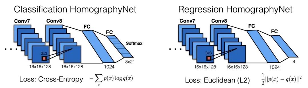 这样设置网络非常直观,使用L2损失训练,测试时直接输出8个float values,但是没有置信度confidence。即在使用网络时,无法知道当前输出单应性可靠程度。