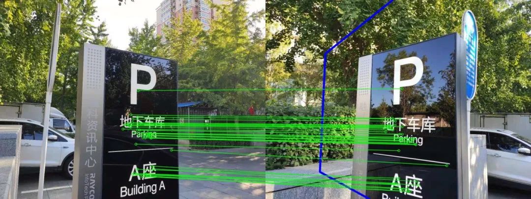 平面外背景物体不符合单应性原理,偏离很大,完全无法对齐。