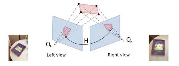此处不经证明的给出:同一个 [无镜头畸变] 的相机从不同位置拍摄 [同一平面物体] 的图像之间存在单应性,可以用 [投影变换] 表示 。