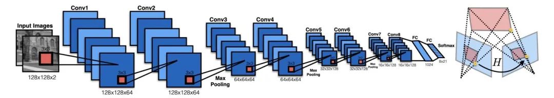 HomographyNet是发表在CVPR 2016的一种用深度学习计算单应性变换的网络,即输入两张图,直接输出单应性矩阵 。