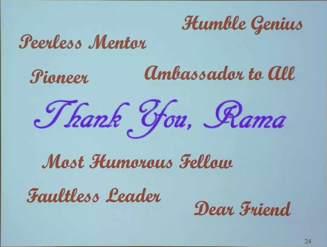 会议的最后是Rama致辞。秉持着一贯的幽默风范,他感谢了他的父母、妻子、儿女、老师们、朋友们、秘书Janice。当讲到学生的时候,他不禁动情,泪沾眼眶,默然无声了。