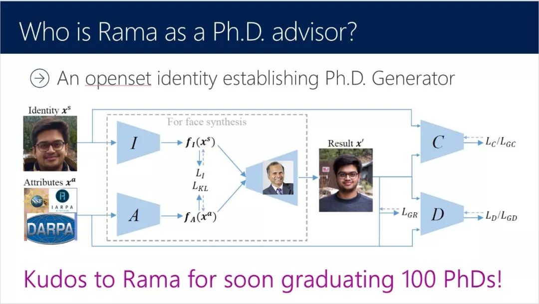 华刚接下来系统地讲述了自己最近在可控图像模式生成方面的系列工作,强调了可控性的根本是要生成将不同的控制元素分离开来的表述,并穿插着将Rama的不同的角色比拟成可控图像生成器中的不同模块。比方说Rama作为导师,在培养学生过程中和学生的关系就是对抗学习网络中辨识器和生成器之间的关系。Rama的学识能够保证学生尽快的抓住要点,收敛到正确的分布。同时他还是一个开放数据博士身份生成器,以此来表达对Rama即将毕业第一百个毕业生的敬仰之情。