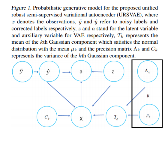在统一鲁棒半监督变分自编码器(URSVAE)中,通过同时处理噪声标签和异常值,提出了一种新的噪声鲁棒半监督深度生成模型。输入数据的不确定性通常是将不确定性优先于概率密度分布的参数,以确保变分编码器对异常值的鲁棒性。随后,我们将噪声转换模型自然地集成到我们的模型中,以减轻噪声标签的有害影响。此外,为了进一步增强鲁棒性,采用鲁棒散度测度,推导并优化了新的变分下界来推断网络参数。通过证明对所提证据下界的影响函数是有界的,证明了所提模型在存在复合噪声的情况下在分类方面的巨大潜力。通过对图像分类任务的评价和与现有方法的比较,实验结果表明了该框架的优越性。