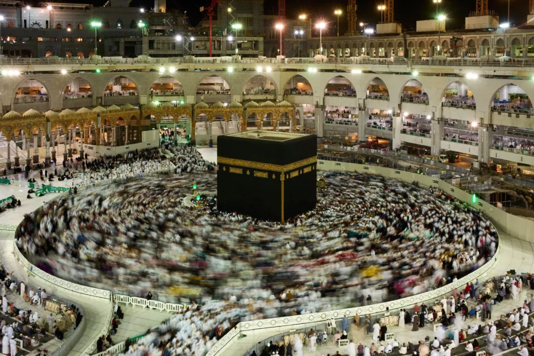 即使是在深夜,麦加禁寺中围绕克尔白天房朝拜和环行的穆斯林信众依然会达到数千人之多。
