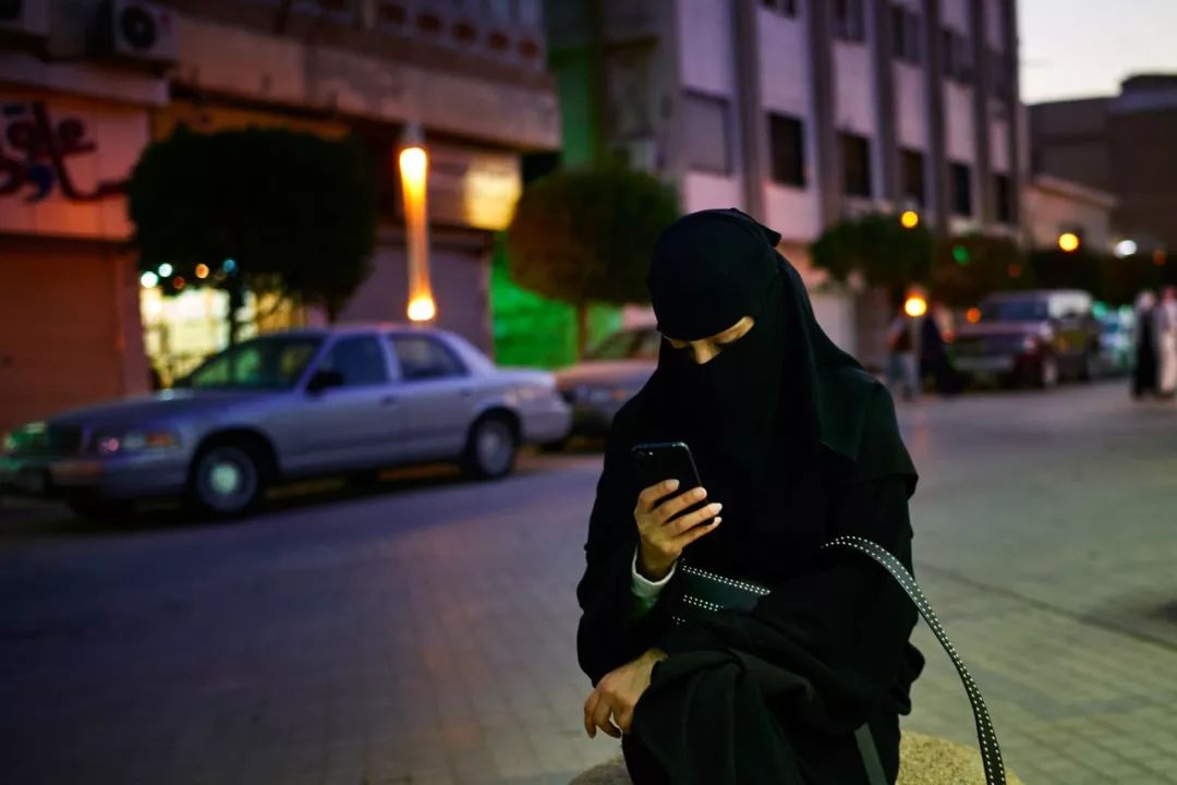 在奥拉亚区一处高档商场的停车场,一位头戴传统“尼卡布”面纱、怀抱名牌手袋的妇女在使用iPhone手机。