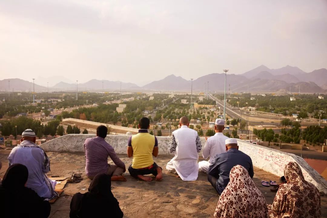在麦加东面的阿拉法特山,造访圣地的穆斯林信众正面朝著名的阿拉法特平原做祷告。