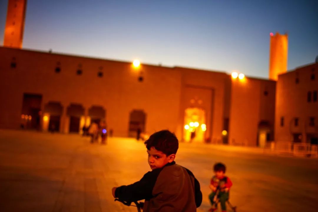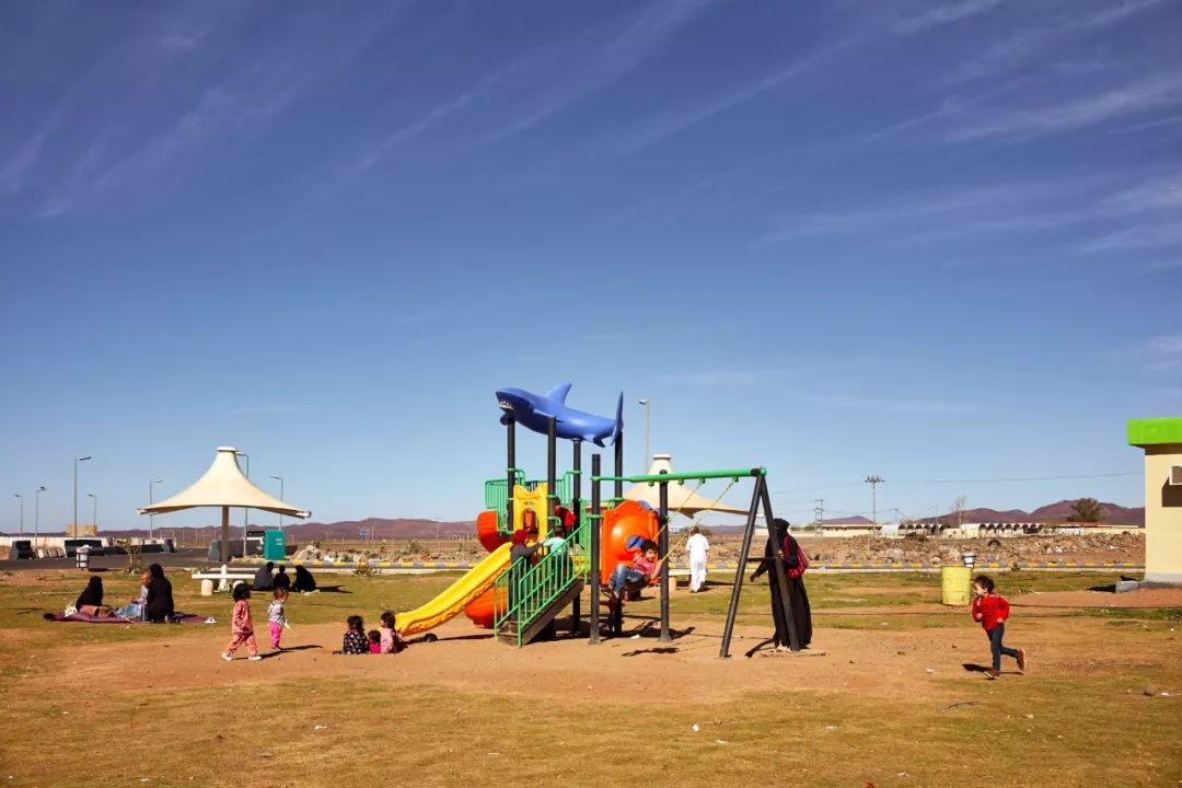 在圣城麦地那的一处敞开式公园,一群当地儿童正在玩耍。沙特的大部分游乐场和封闭式公园至今仍不对单身人士开放,仅接纳家庭游客。