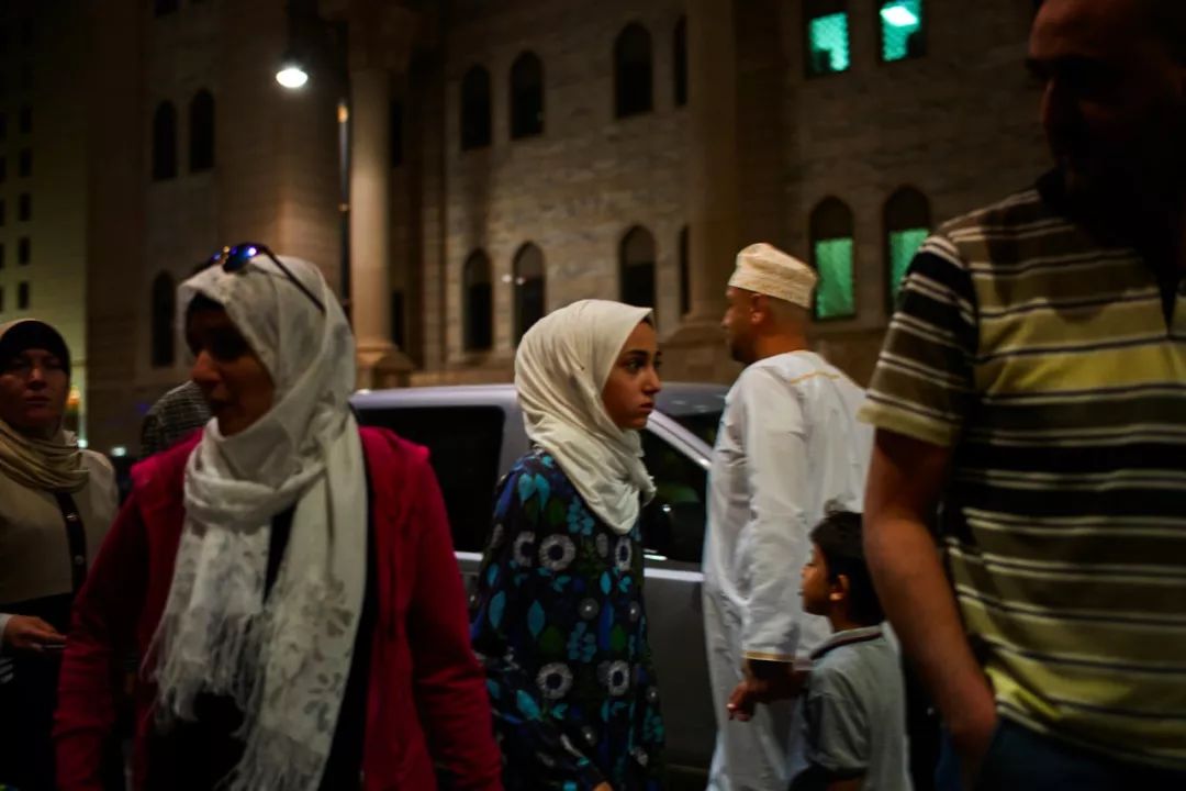 麦地那街头,佩戴白色“希贾布”头巾的妇女来去匆匆。