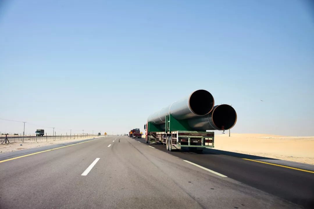 运载着巨大管道构件的载重车行驶在连接利雅得和达曼的沙漠公路上。