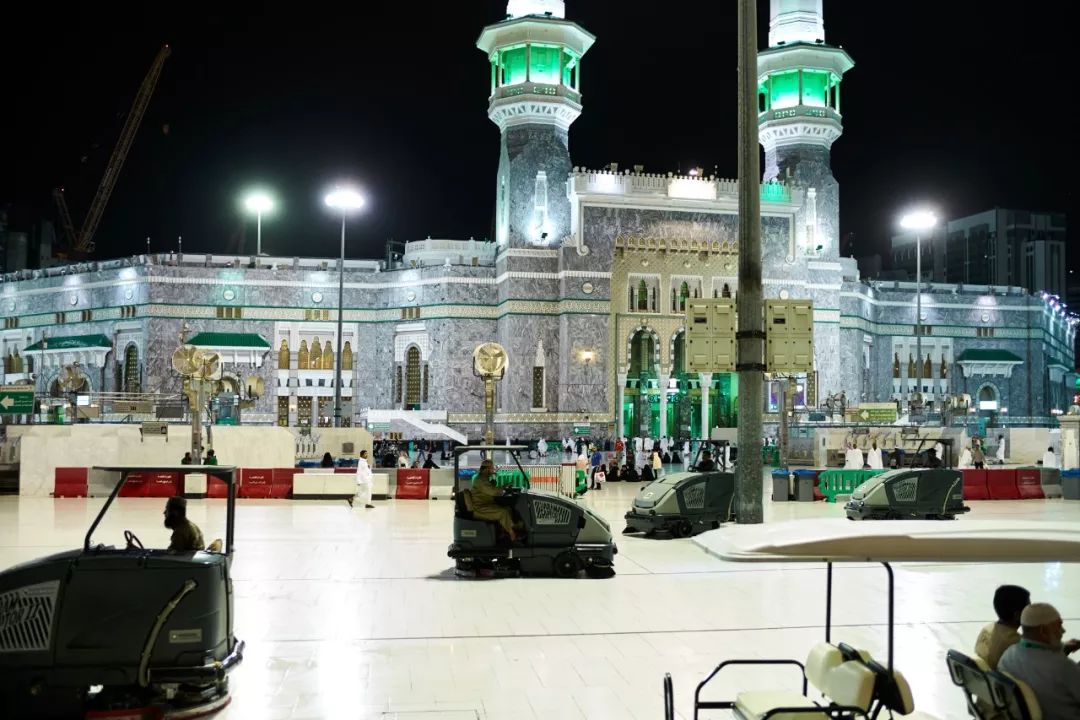 深夜,电动吸尘车正在清扫灯火通明的禁寺广场。背景中属于沙特本·拉登集团的起重机显示寺院主体建筑的扩建仍在继续进行。