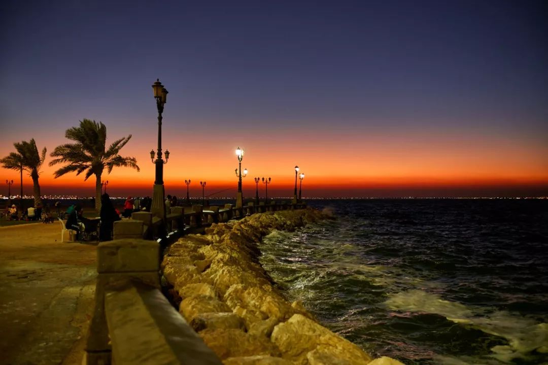 在东部要港达曼的一处海滨公园,晚霞正降临在远处的波斯湾上空。