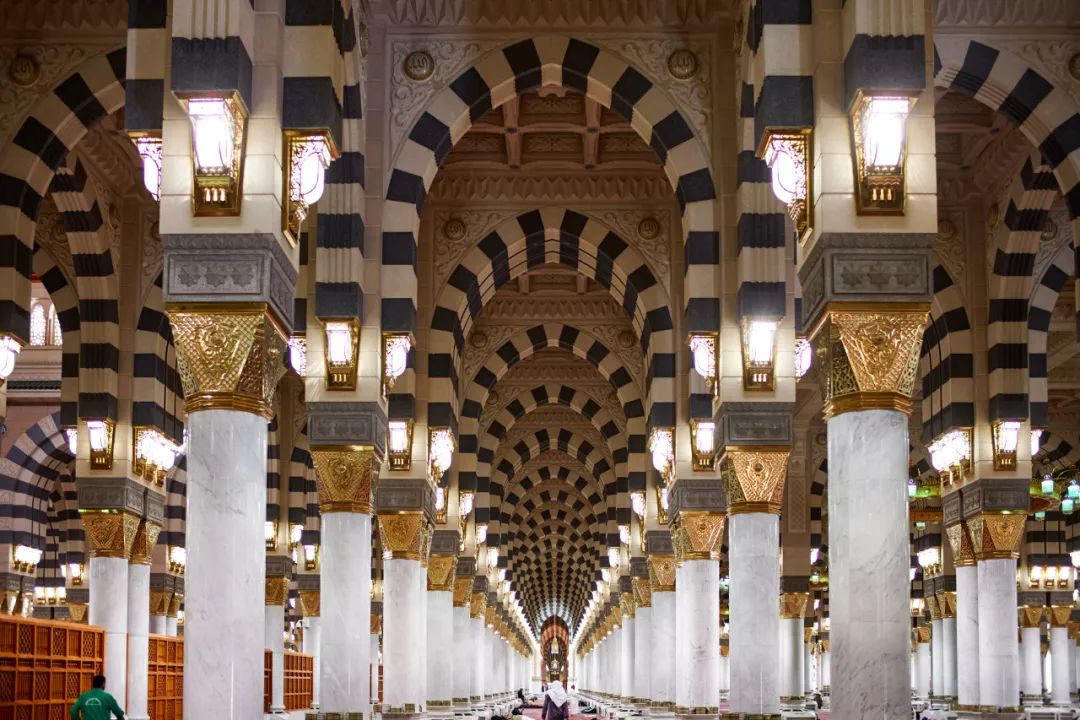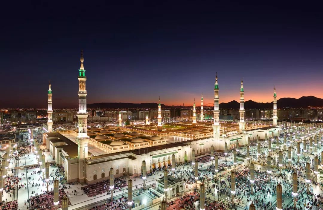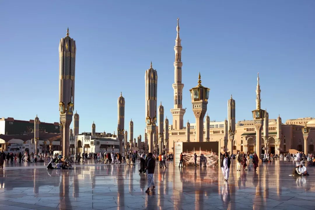先知穆罕默德陵墓所在的麦地那先知寺是伊斯兰教历史上第二座清真寺。广场的250具电动遮阳伞在白昼和雨雪天气会全部张开,以供穆斯林信众在伞下举行集体礼拜。