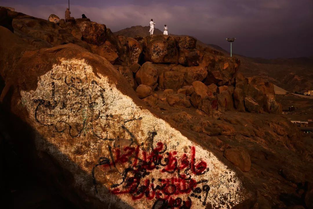 朝圣信众亲吻传说中先知穆罕默德曾经抚摸过的一块巨石,并在上面写下自己的名字。
