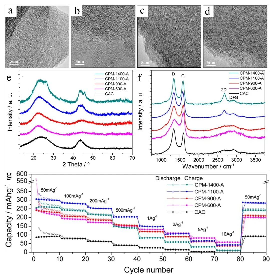 类石墨结构通常是指含有石墨层和少量随机排列缺陷的无序涡轮层状纳米畴。它能够为离子的嵌入/脱嵌提供较大的层间距,有助于储存更多的离子并降低存储过程中的能量屏障。同时,它的高石墨化度能够加速离子的扩散和电子传输过程,从而提升扩散动力学。因此,通过调控生物质衍生碳中类石墨结构的含量、层间距和石墨化度,可以协同提高有效存储位点,从而提高循环稳定性和倍率性能。