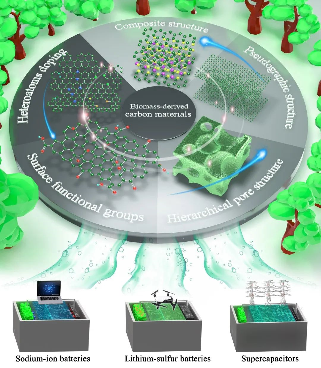 文章系统地综述了生物质衍生碳作为一种可持续,绿色电极在电化学能量存储设备中的应用,重点从调控类石墨结构、层级孔结构、表面官能团结构、异质原子掺杂结构和复合结构的角度总结提高有效存储位点和扩散动力学的各种机制,揭示了生物质衍生碳在钠离子电池、锂-硫电池和超级电容器中提升电化学性能的机理。
