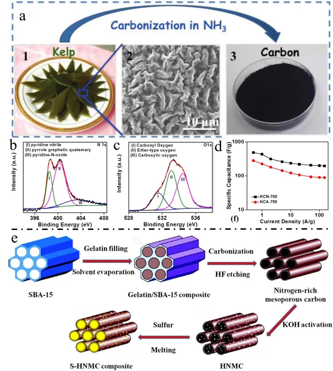 层级孔结构由 2 nm 以下的微孔,2~50 nm 的介孔和 50 nm 以上的大孔组成。在钠离子电池中,它能够为电解液进入生物质衍生碳表面提供有效通道,进而缩短钠离子的扩散路径。它还能够增加生物质衍生碳的比表面积,从而提供更多的有效吸收存储位点。在超级电容器中,它可以通过提供快速的离子/电子转移动力学和减轻充放电过程中的结构破坏来增加赝电容容量。在锂-硫电池中,它能形成一个电子导电网络来捕获可溶的多硫化物中间产物,有效地提高硫在锂离子反应中的利用率。