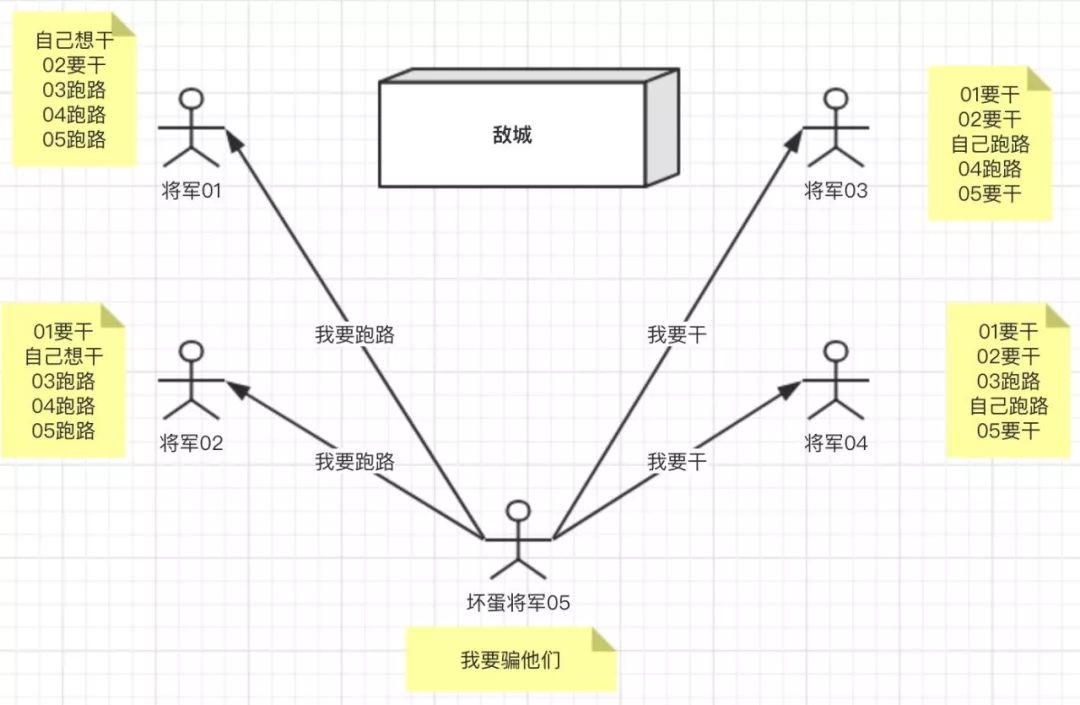坏蛋将军05就可以理解为一个作恶的节点,他向不同的节点传递不同的消息,让系统内部的信息出现了不一致。(来源:liheng)