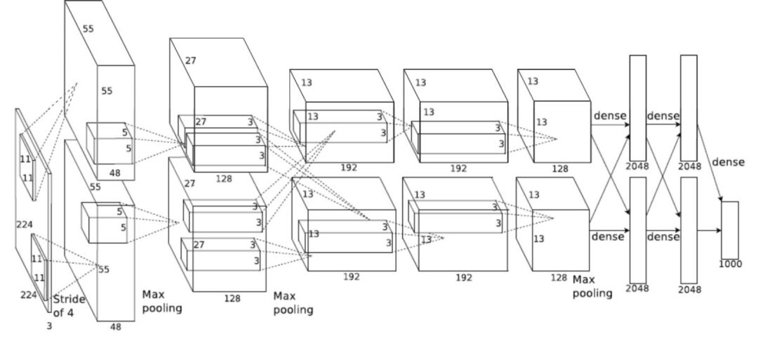 AlexNet是一个使用ReLU激活函数,包含6千万参数的卷积神经网络。其最主要的贡献在于展示了深层网络的强大性能,因为就其本质而言,它的架构是过去的神经网络的更深版本。
