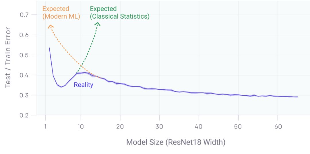 这篇文章所探讨的深度双波谷( (Deep) Double Descent)现象与经典机器学习和现代深度学习的流行观点背道而驰。在经典机器学习中,模型复杂性伴随着偏差-方差权衡。模型太弱,则不能充分捕捉数据结构,而模型太强,则会导致过拟合,涵盖了无法泛化的虚假模式。正因为如此,在经典机器学习中,随着模型变大,测试误差预期会下降,而一旦模型开始过拟合,那么测试误差又开始增加。实践中,在深度学习中,模型通常过度参数化,但看上去对较大模型的测试性能有所改进。这种冲突是隐藏在深度双波谷( (deep) double descent)背后的动机。深度双波谷扩展了Belkin 等人Double Descent论文, 通过实证证明了Double Descent对更广泛类型的深度学习模型的效果,以及它对模型大小、训练时间和数据集大小的适用性。