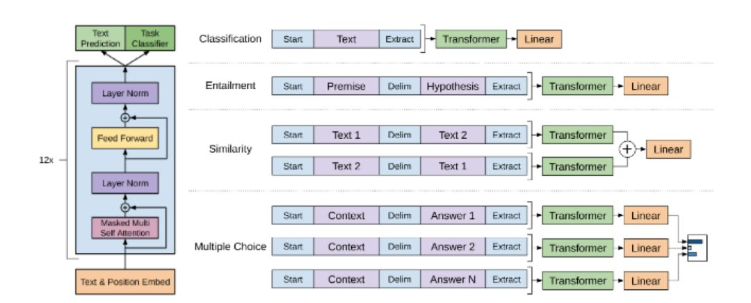 :即前文OpenAI发表的GPT论文。这篇文章深入研究了在多个不同类型问题中,使用相同预训练参数(仅简单微调)在下游任务中进行训练的想法。考虑到从头训练现代语言模型的高昂代价,这个方法非常具有说服力。