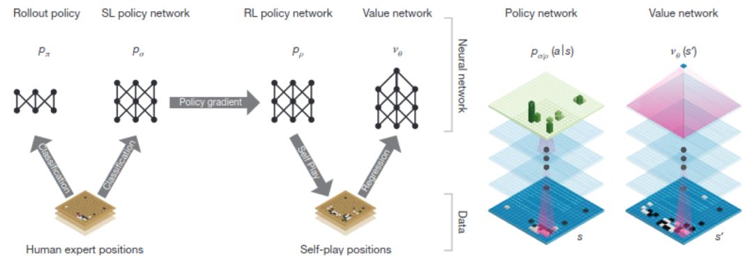 在深蓝打败Kasparov后,AI社区向围棋届称霸进军。相对国际象棋,围棋有更广阔的游戏阵地,也更依赖于人类玩家的直觉。在AlphaGo之前类似于Crazy Stone和Zen等最优秀的围棋AI系统,基本都是带有许多手工探索引导树形搜索的蒙特卡洛树形搜索组合。从这些AI系统的进展来看,打败最优秀的围棋选手还需要很多年。虽说之前已有将深度学习应用于围棋的尝试,还没有哪个AI系统达到了AlphaGo的成就,而AlphaGo也用巨型算力集成了不少这些尝试中的技术成果。具体来说,AlphaGo包含一个策略网络和一个价值网络,分别可以缩小树形搜索,和对树形搜索舍项。这些网络最开始由标准有监督学习训练,之后再接受强化机器学习。