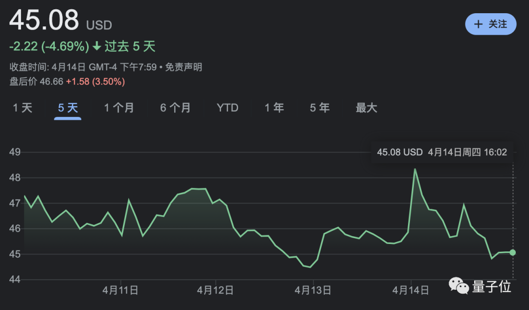 收购计划曝光后,推特股价先是强势高涨,周四最高股价达到48.5美元,但收盘时倒跌1.5%,报45.18美元/股。目前已持续下跌至45.08美元。