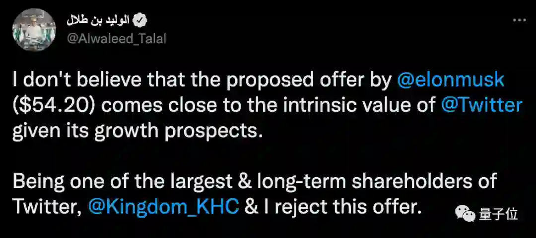 推特的大股东沙特王子Alwaleed bin Talal也拒绝了马斯克的报价,他认为推特远不止值现在的价格。