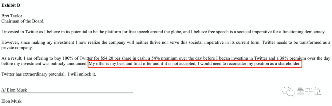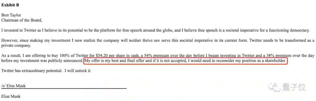 文件中披露了这次对推特的最新收购计划,同时还包含了马斯克致董事会主席的一封信。