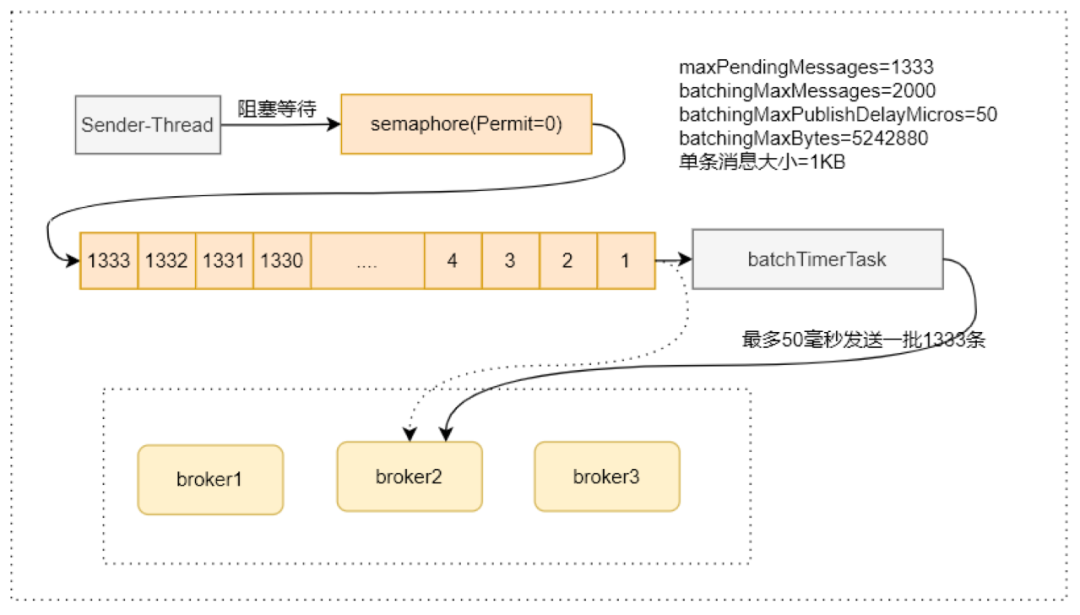 建议 batchingMaxPublishDelayMicros 不要过大,确保 batchingMaxMessages 比 maxPendingMessages 要大,否则等待 batchingMaxPublishDelayMicros 才会发送。