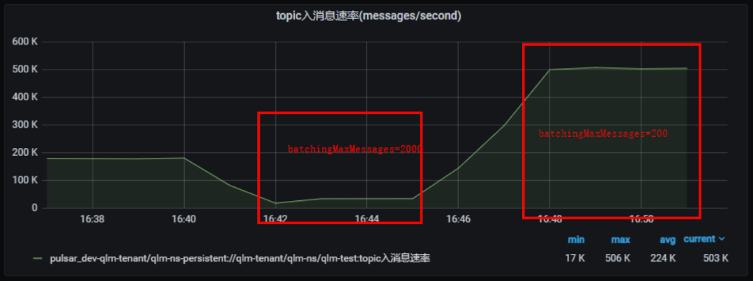 另外,测试发现 batchingMaxMessages 调小后性能提升 10 倍之多: