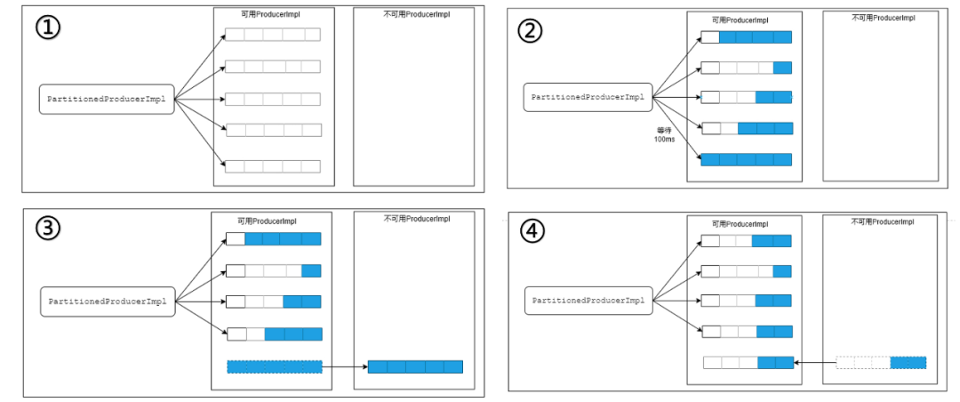 实践中可分为可用 Producer 和不可用 Producer 两个列表。在 ① 中,两个列表都处于初始化状态并可用;在 ② 中,某个可用分区阻塞一段时间后可以等待一段时间;若不可用就移动到不可用列表中,如 ③ 所示;当分区可用比例达到阈值再挪回可用列表,如 ④ 所示。