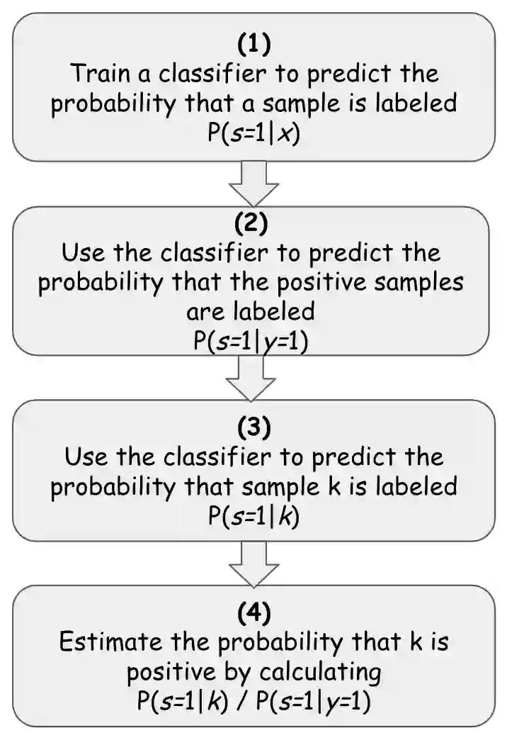 更正式地说,给定一个未标记的数据集,其中只有一组标记为正的样本,如果我们估计P(s=1|x) / P(s=1|y=1),我们就可以估计未标记的样本x为正的概率。幸运的是,我们几乎可以使用任何基于sklearn的分类器,按照以下步骤来估计: