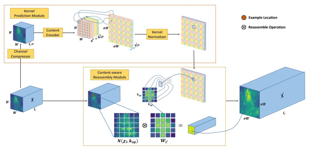 MMLab 的 CARAFE[22],用来进行特征上采样。其计算方式也是用窗口内像素特征的特征加权平均。其特殊之处在于,用于加权的权重是学习出来的,通过对特征变换、pixelshuffle上采样和通道归一化得到。
