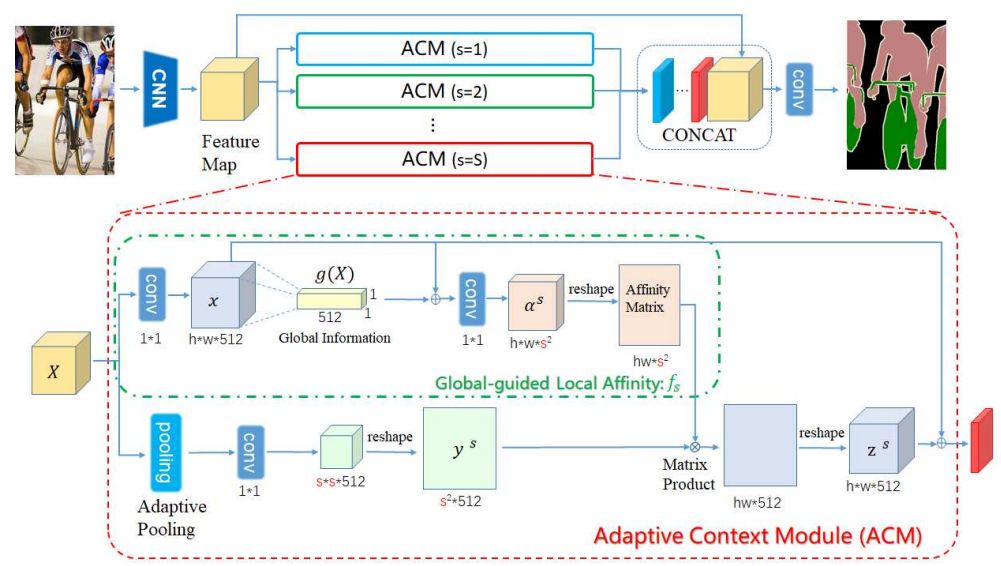 上述的几篇文章,映射和反映射矩阵,多是通过 卷积学习到的。其实,最常见的池化-上采样,也属于一种超级简化的映射-反映射范式。PSPNet 中的 PPM 和 DeeplabV3 中的 GAP 带来的效益,也可由这个角度进行一定的解释。SIAT-MMLAB 的 APCNet[14],也属于这一范式的一个具体结构。其 ACM 模块的映射步骤用池化,反映射用学习到的反映射矩阵 (Global-guided Local Affinity)。此外,APCNet 和上述的 Beyonds Grid 都用了多路并行,每路用不同的